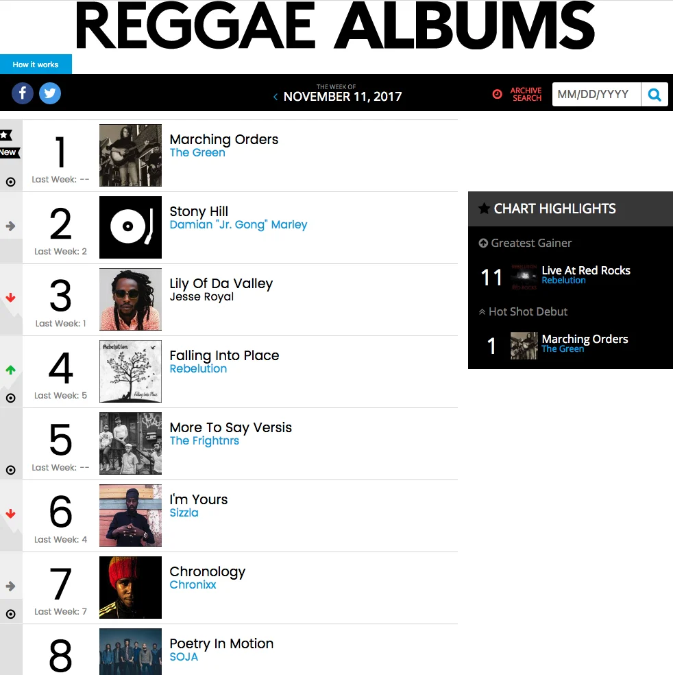 The week of November 11, The Green’s new album, Marching Orders, has impressively debuted at #1 on the Billboard Reggae Chart and reached another charting milestone as the album hit #15 on Billboard’s Independent Release and #62 on Billboard’s Top 200 Sales Chart. MARCHING ORDERS is the band’s fourth studio album, their third album to claim the #1 spot on the Billboard Reggae Chart, and their highest charting album on the Top 200.